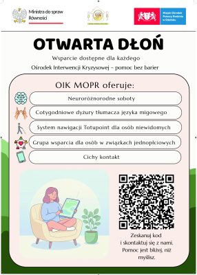 OIK MOPR w Gdańsku stara się sprostać potrzebom mieszkanek i mieszkańców. Celem jest zniesienie barier i zwiększenie dostępności usług kryzysowych dla różnych grup szczególnego ryzyka. W ramach projektu MOPR pt. „Otwarta Dłoń – OIK dostępny dla każdego”, współfinansowanego z Programu osłonowego 2025 „Wspieranie jednostek samorządu terytorialnego w przeciwdziałaniu przemocy domowej jako przemocy ze względu na płeć” (zadanie współfinansowane z dotacji otrzymanej od Ministry ds. Równości), w placówce wdrożono też: cotygodniowe dyżury tłumacza Polskiego Języka Migowego dla osób z dysfunkcją narządu słuchu; system nawigacyjno-informacyjny Totupoint, pomagający w przestrzennym poruszaniu się osobom z dysfunkcją narządu wzroku; uruchomiono grupę wsparcia dla kobiet w związkach jednopłciowych i dostosowano infrastrukturę dla osób z niepełnosprawnością ruchową. Osoby neuroróżnorodne, w każdą sobotę mają możliwość uczestnictwa w konsultacjach ze specjalistami: bez pośpiechu, w przyjaznej, bezpiecznej, przewidywalnej przestrzeni oraz z poszanowaniem indywidualnych potrzeb. W placówce m.in. przygotowano przyjazną sensorycznie przestrzeń, z piktogramową ścieżką wizyty. Tego dnia nie ma tam zbędnych dźwięków, muzyki czy jaskrawego światła.